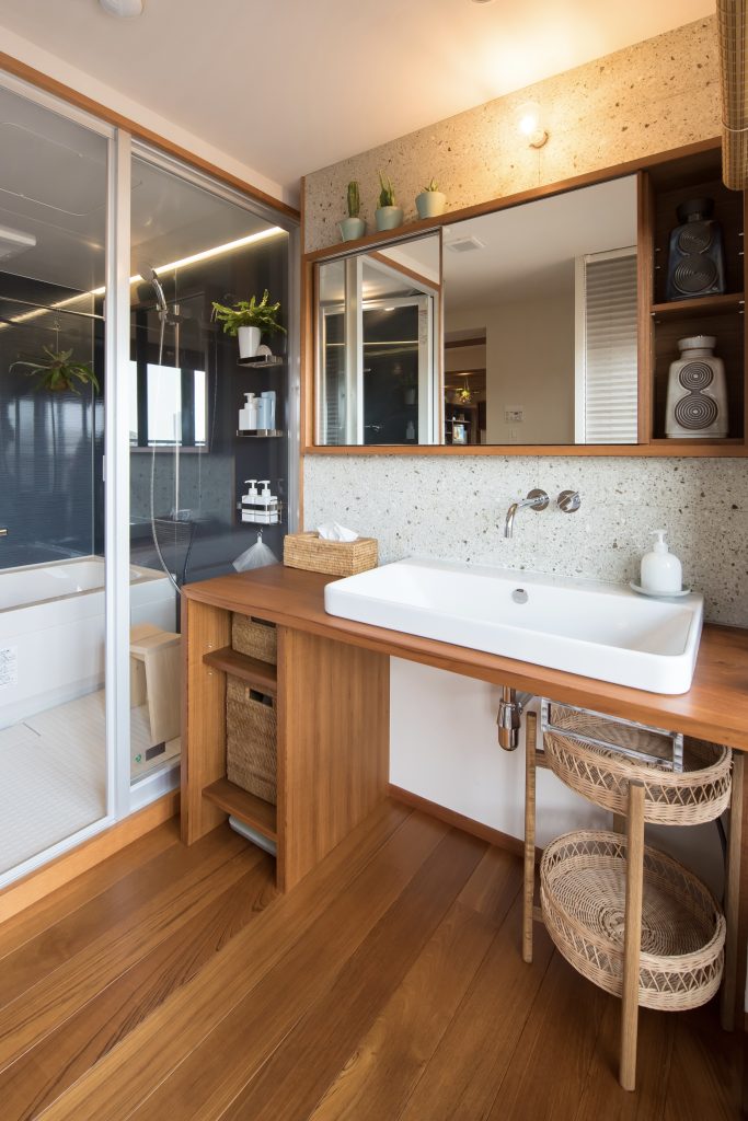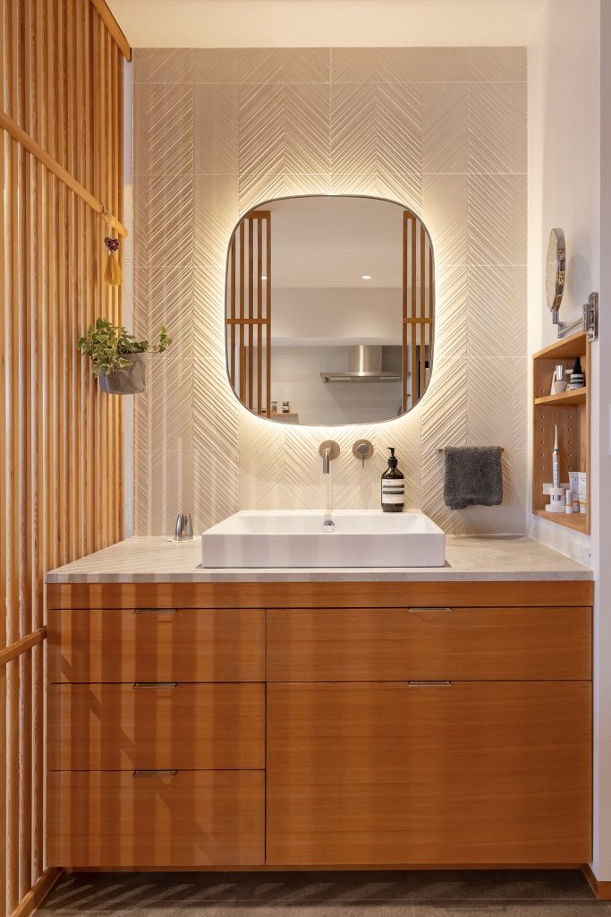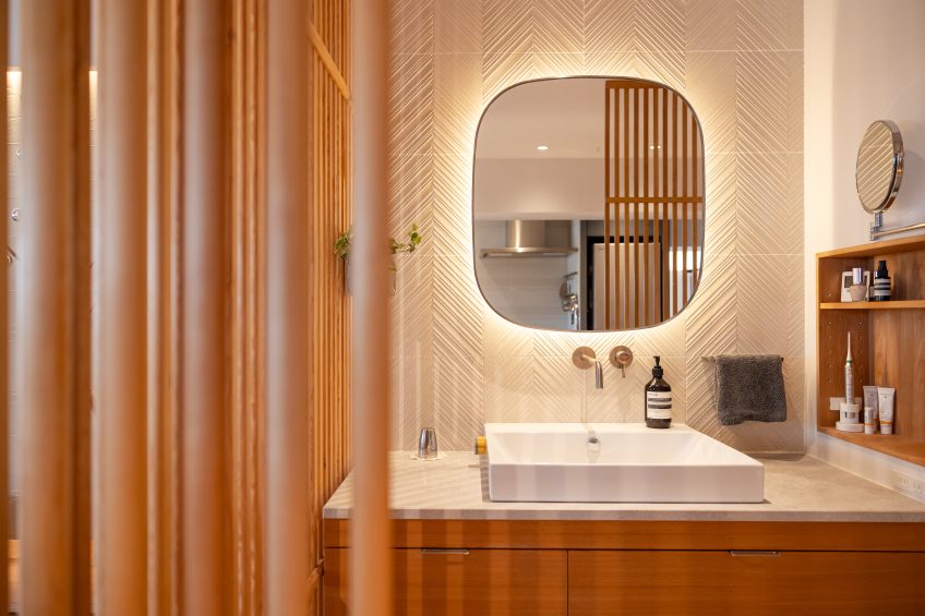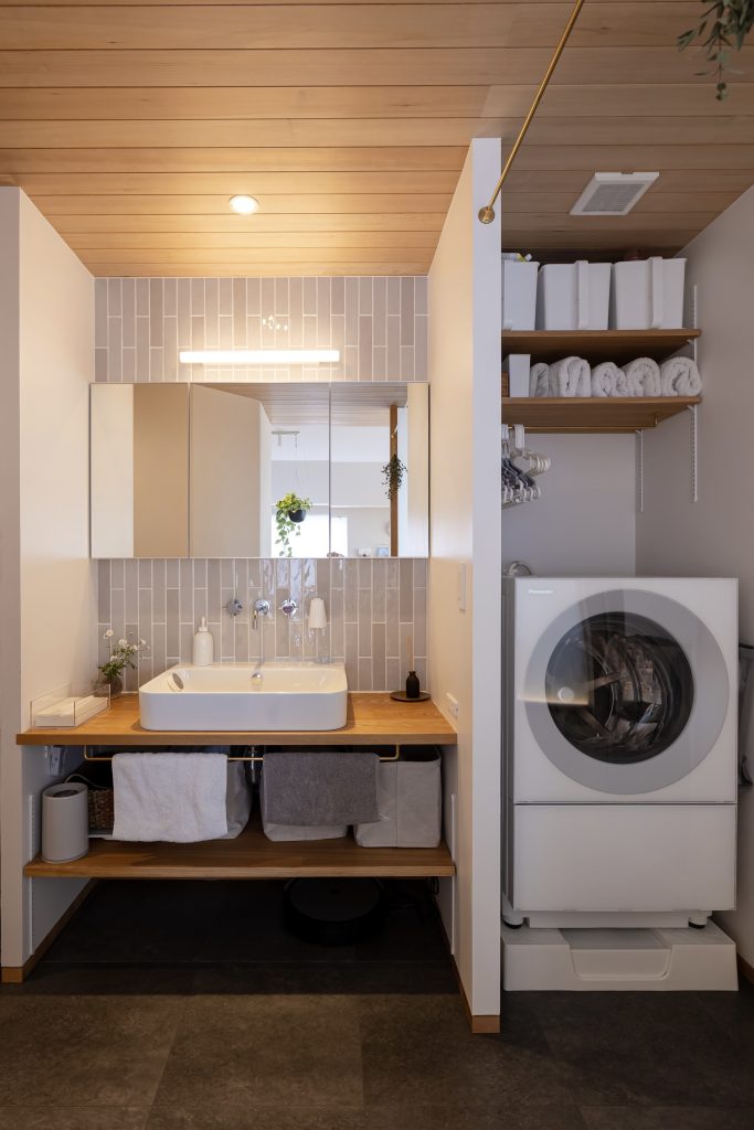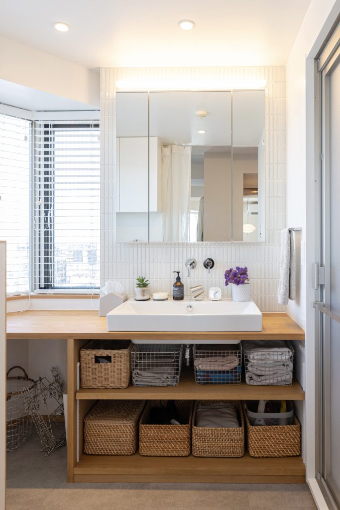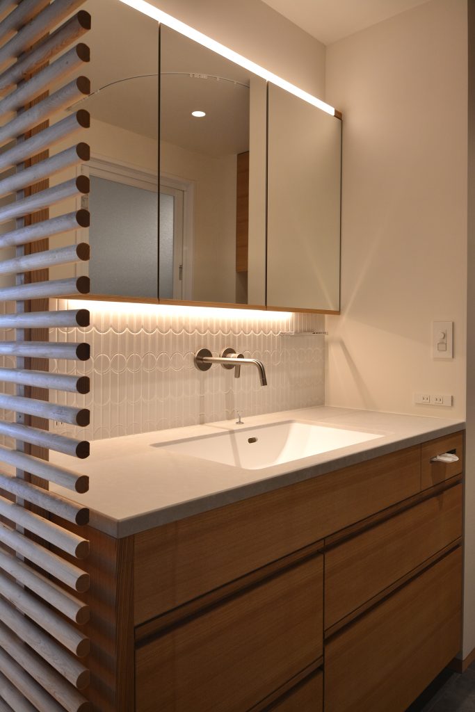 縦ルーバーの壁は視線を程よく遮りながら、空気がこもらない。サニタリーは家の中心にあっても、間接的な光を取り入れ、明るい印象にすることができた事例です。間接照明を仕込んだ造作デザイン鏡がとても美しくて印象的。鏡裏に収納する小物が少ない方にオススメの方法です。