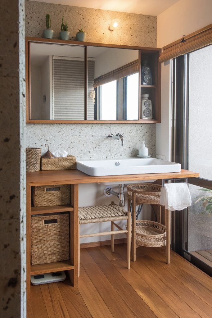 バルコニーの窓に隣接した洗面所。大谷石とチーク、そしてカゴ使いがとても上手です。
