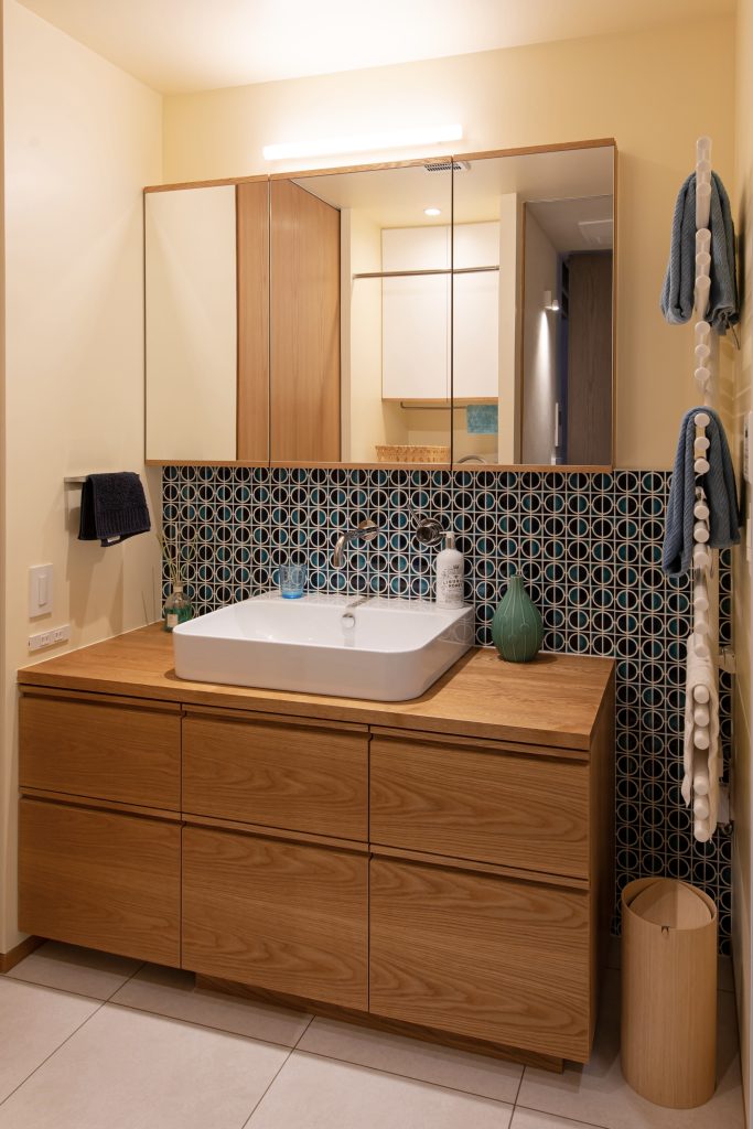 幾何学タイルが印象的な洗面所(芝浦Mさんの家)