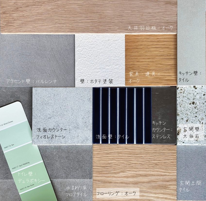 素材は、木部のオークと様々な質感の柔らかなグレーでシンプルにまとめた落ち着いた雰囲気です。すっきりと整った空間イメージになると思います。