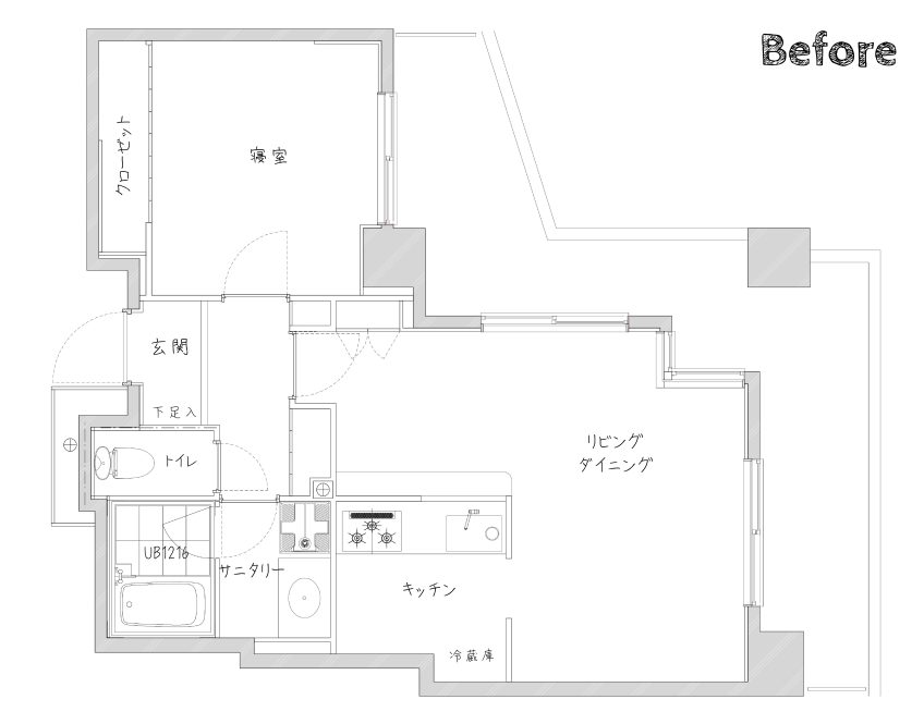 下の間取りは、コンパクトなのに動線が長く、サニタリーやキッチンが行き止まりになっていて、空気も視線も通らず、窓の多さのわりに暗い雰囲気がありました。