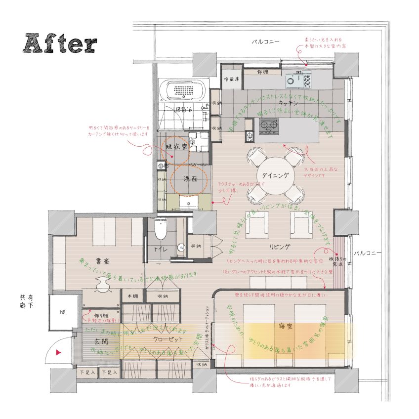 新しいプランでは、もったいなかった廊下をなくし、寝室と書斎以外は連続した空間になるように考えました。